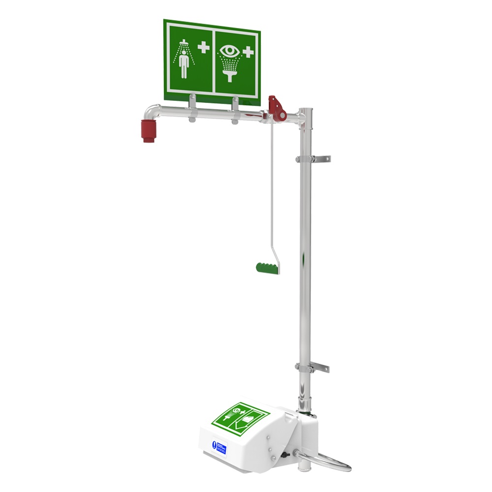 Notduschkombinationen verbinden Körper-Notdusche und Augendusche in einer Einheit. Sie sind ideal, wenn sowohl eine großflächige Körperdusche als auch eine gezielte Augenspülung am gleichen Ort verfügbar sein müssen.